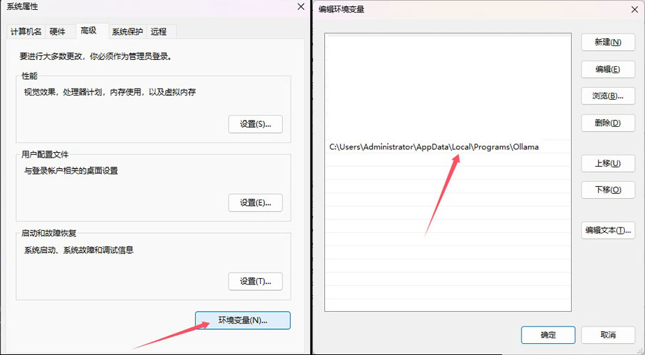 - 配置系统环境变量,在path中添加 ollama安装路径。