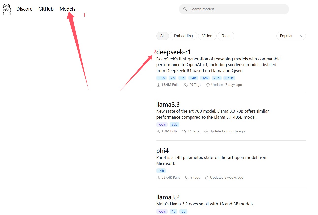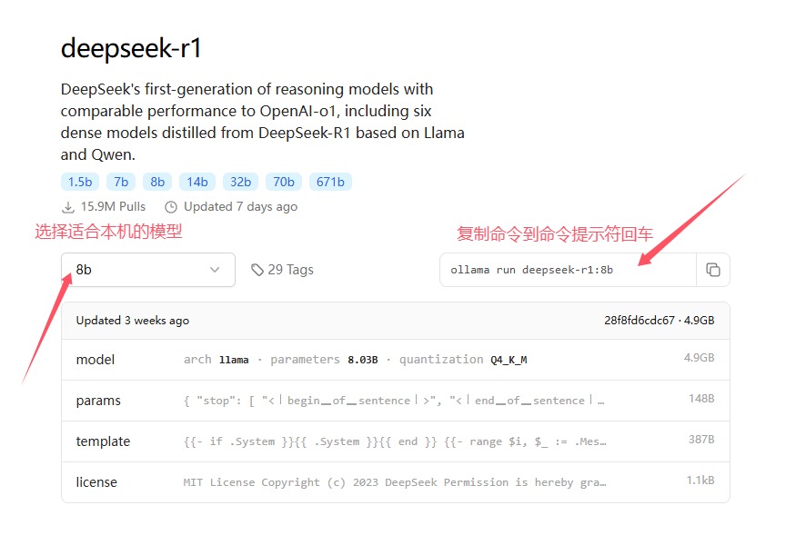 - 在ollama官网点击models,选择deepseek-r1并选择适合参数的模型,以8b为例