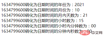 <?php echo '1634799600转化为日期时间的年份为:',date('Y', 1634799600),'<br/>'; echo '1634799600转化为日期时间的月份为:',date('m', 1634799600),'<br/>'; echo '1634799600转化为日期时间的月内天数为:',date('d', 1634799600),'<br/>'; echo '1634799600转化为日期时间的小时数为:',date('H', 1634799600),'<br/>'; echo '1634799600转化为日期时间的小时内分钟数为:',date('i', 1634799600),'<br/>'; echo '1634799600转化为日期时间的分钟内秒数为:',date('s', 1634799600),'<br/>'; ?>