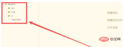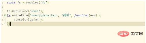 打开新建的JS文件,导入fs模块,并使用mkdirSync方法创建文件夹user,然后调用writeFile方法,向文件中写入内容
