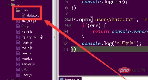 打开js文件夹,可以发现目录下生成了user文件夹,文件夹下生成data.txt文件