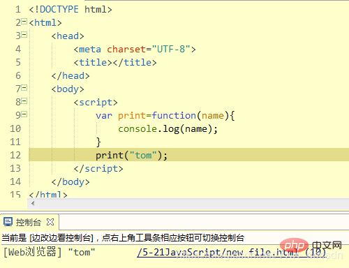 <script> var print=function(name){ console.log(name); } print("tom"); </script>