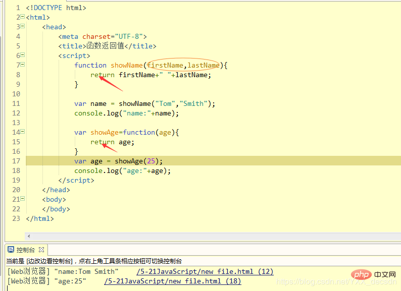 函数返回值:JavaScript函数没有定义函数的返回值类型部分,JavaScript函数根据函数体中return返回值语句来判断返回值类型;若不存在return返回值语句,则函数无返回值。