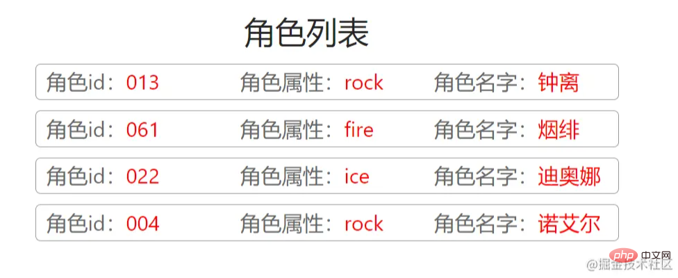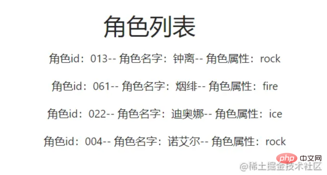 @Component({ selector:'app-hero-display-card', template:` <h2 [style]="{textAlign:'center'}">角色列表</h2> <ul class="hero-card-box"> <li class="hero-card-item" *ngFor="let h of heroesList"> <p [style]="{textAlign:'center'}"> 角色id:{{h.id}}-- 角色名字:{{h.name}}-- 角色属性:{{h.features}} </p> </li> </ul> `, styles:[ `.hero-card-box{ width: 600px; margin: 10px auto; } .hero-card-item{ list-style: none; } ` ] }) export class HeroDisplayCard { public heroesList = [ {id:'013',name:'钟离',features:'rock'}, {id:'061',name:'烟绯',features:'fire'}, {id:'022',name:'迪奥娜',features:'ice'}, {id:'004',name:'诺艾尔',features:'rock'}, ] }