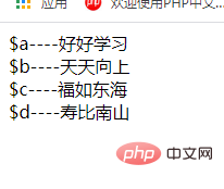 list($a , $b , $c, $d) = array('好好学习' ,'天天向上' ,'福如东海','寿比南山');