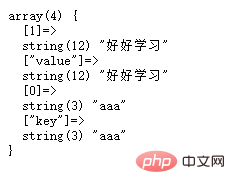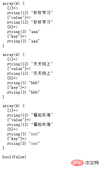 由上述示例可以看出运行第一次each函数,将数组元素中的第一个元素也就是aaa=>好好学习拆为一个新的数组。可以理解为,each函数读取了第一个元素,将第一个元素分解开了,在新数组里面,将原值(好好学习)放了索引下标1里面,同时放到了关联下标value里面,将原键(aaa),放到了关联下标key里面,放到了索引下标0里面。
