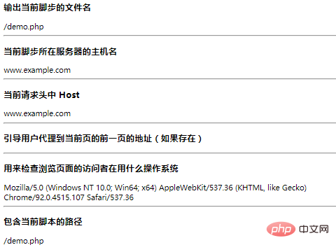 <?php //输出当前脚步的文件名 echo "<h3>输出当前脚步的文件名</h3>"; echo $_SERVER['PHP_SELF']; echo "<hr/>"; //当前脚步所在服务器的主机名 echo "<h3>当前脚步所在服务器的主机名</h3>"; echo $_SERVER['SERVER_NAME']; echo "<hr/>"; //当前请求头中 Host echo "<h3>当前请求头中 Host</h3>"; echo $_SERVER['HTTP_HOST']; echo "<hr/>"; //引导用户代理到当前页的前一页的地址(如果存在) echo "<h3>引导用户代理到当前页的前一页的地址(如果存在)</h3>"; echo $_SERVER['HTTP_REFERER']; echo "<hr/>"; //用来检查浏览页面的访问者在用什么操作系统 echo "<h3>用来检查浏览页面的访问者在用什么操作系统</h3>"; echo $_SERVER['HTTP_USER_AGENT']; echo "<hr/>"; //包含当前脚本的路径 echo "<h3>包含当前脚本的路径</h3>"; echo $_SERVER['SCRIPT_NAME']; ?>