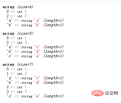 <?php $a = [1,'2'=>2,'a'=>'a','b'=>'b']; $b = [1,'2'=>3,'a'=>'c','b'=>'d','c'=>'e']; $c = array_merge($a,$b); var_dump($a); var_dump($b); var_dump($c); ?>