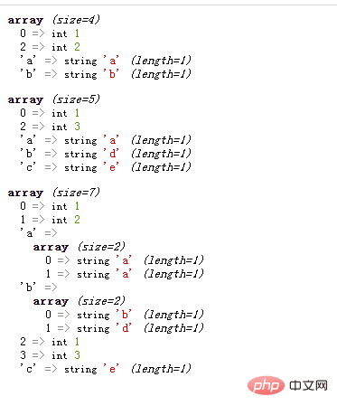 <?php $a = [1,'2'=>2,'a'=>'a','b'=>'b']; $b = [1,'2'=>3,'a'=>'a','b'=>'d','c'=>'e']; $c = array_merge_recursive($a,$b); var_dump($a); var_dump($b); var_dump($c); ?>