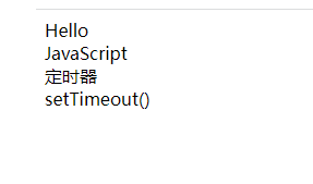 <!DOCTYPE html> <html> <head> <meta charset="UTF-8"> <title>JavaScript</title> </head> <body> <script type="text/javascript"> var myFun = function (str = 'JavaScript'){ document.write(str + "<br>"); }; setTimeout(myFun, 500, 'Hello'); setTimeout(myFun, 1000); setTimeout(function(){ document.write("定时器<br>"); }, 1500) setTimeout("document.write("setTimeout()")", 2000); </script> </body> </html>