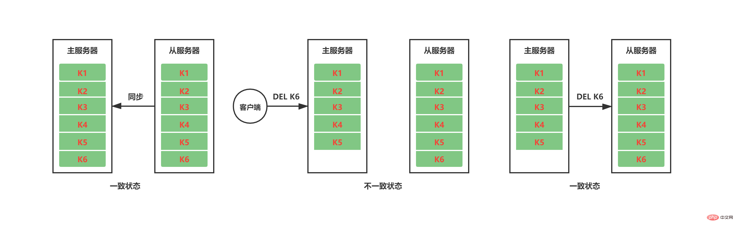 当同步工作完成之后,主从之间需要通过命令传播来维持数据状态的一致性。 如下图,当前主从服务器之间完成同步工作之后,主服务接收客户端的DEL K6指令后删除了K6,此时从服务器仍然存在K6,主从数据状态并不一致。为了维持主从服务器状态一致,主服务器会将导致自己数据状态发生改变的命令传播到从服务器执行,当从服务器也执行了相同的命令之后,主从服务器之间的数据状态将会保持一致。