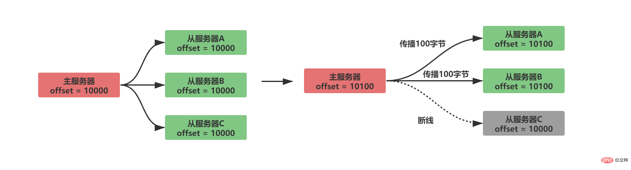 通过对比主从服务器之间的复制偏移量是否相等,能够得知主从服务器之间的数据状态是否保持一致。 假设此时A/B正常传播,C从服务器断线,那么将出现如下情况: