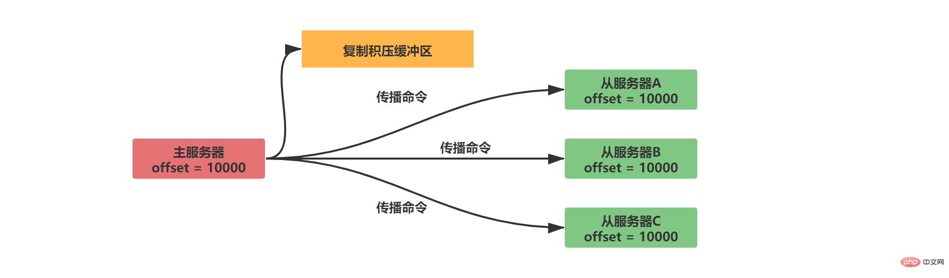 主服务器将缓冲区的写命令发送给从服务器,从服务器接收命令,并执行。