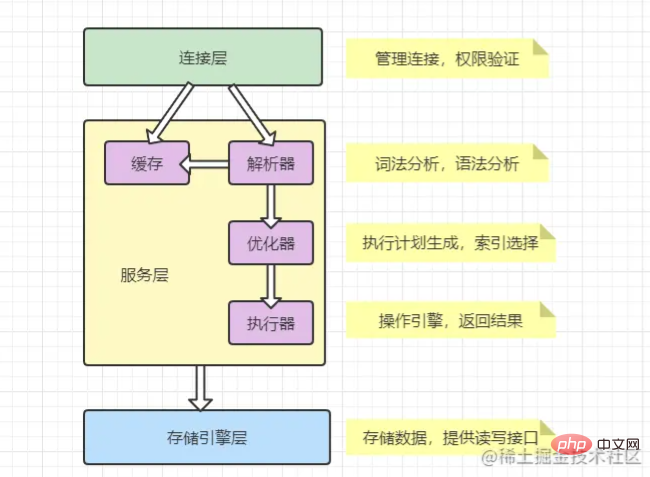 连接层会把 SQL 语句交给服务层,这里面又包含一系列的流程: