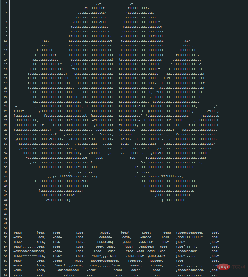 /** * 图片转为字符串 * @param string $img_src 图片地址 * @param int $width_index 横向缩放比例 * @param int $height_index 纵向缩放比例 * @return string 生成的字符串 **/ function img2str($img_src,$width_index,$height_index){ $resource = imagecreatefromjpeg($img_src); $width = imagesx($resource); $height = imagesy($resource); imagefilter($resource, IMG_FILTER_GRAYSCALE); for ($i=0; $i < $height; $i++) { if($i%$height_index==0){ for ($j=0; $j < $width; $j++) { if($j%$width_index==0){ $color_index = imagecolorat($resource, $j, $i); $rgb = imagecolorsforindex($resource,$color_index); $gray = $rgb['red']; $str='O80GCLft*+;:,. '; $r = $gray/255; $offset=(int)ceil($r*(strlen($str)-1)); echo $str[$offset]; } } echo "n"; } } } img2str("./huawei.jpg",1,2);