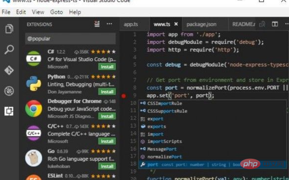 - 支持多种语言(JavaScript, TypeScript等)。可以在此安装自定义扩展,以支持c#、c++、Python等的生态系统。