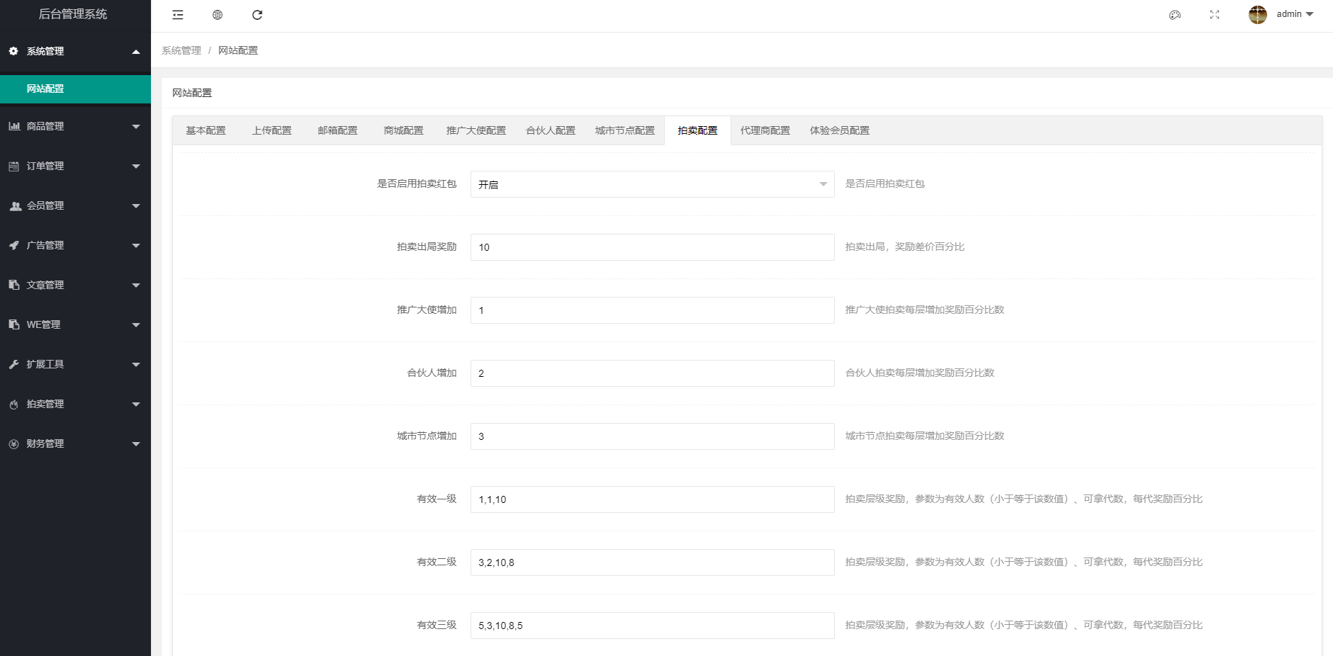系统附带竞拍功能、推广功能、合伙人、虚拟币支付功能、原始股等功能,反正看着比较牛逼的东西