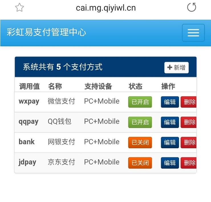 此版本为彩虹易支付原作者二开版本,新加了很多功能,新功能:API退款,轮询支付,网银支付,京东支付,实名认证更多功能自己登录演示后台
