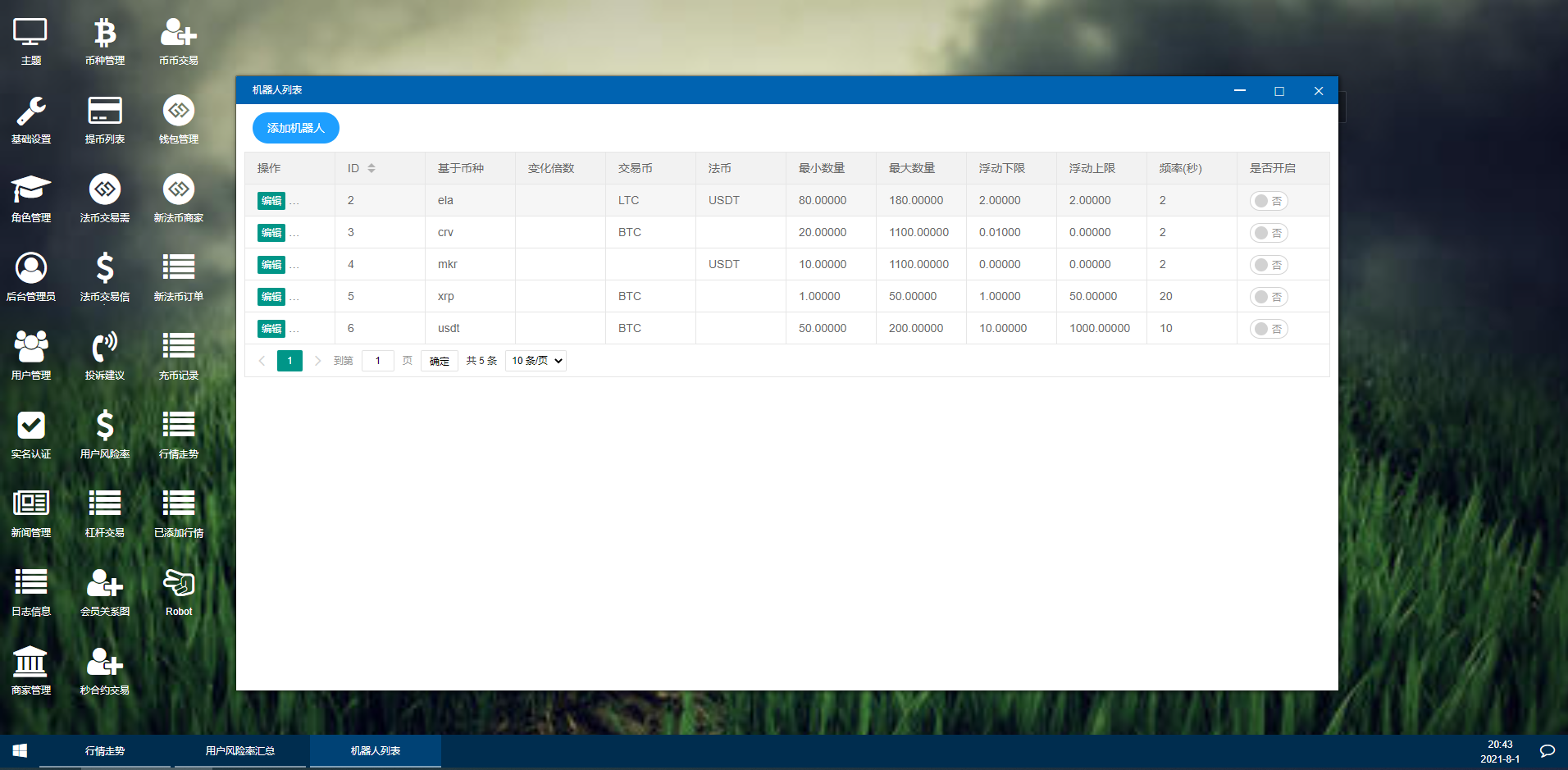 4、币种管理(币种的添加设置、提币账户管理、是否显示、交易对管理)