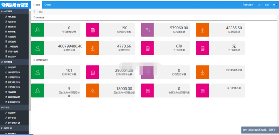 前台中加入了自动抢单功能,重新优化了界面看上去还是比较简洁大气的。同时对代理及商户后台界面也进行了美化