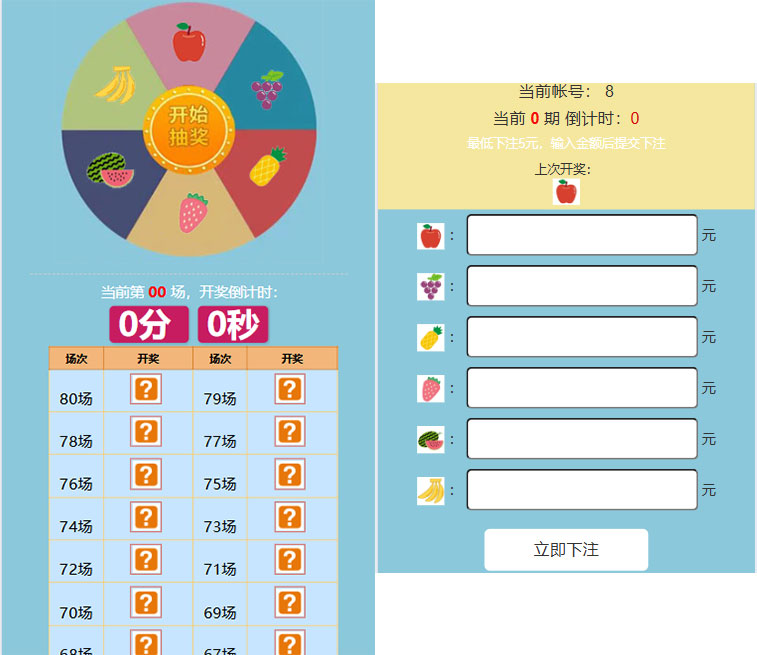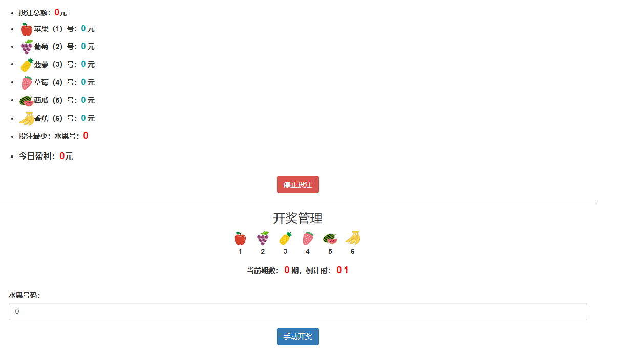 神猴水果开奖游戏是一款基于ThinkPHP3.2.3框架开发的水果竞猜游戏源码,无需任何开奖器采集,直接可在后台设置手动开奖或者定时开奖,支持代理功能,有喜欢尝试的可以下载研究