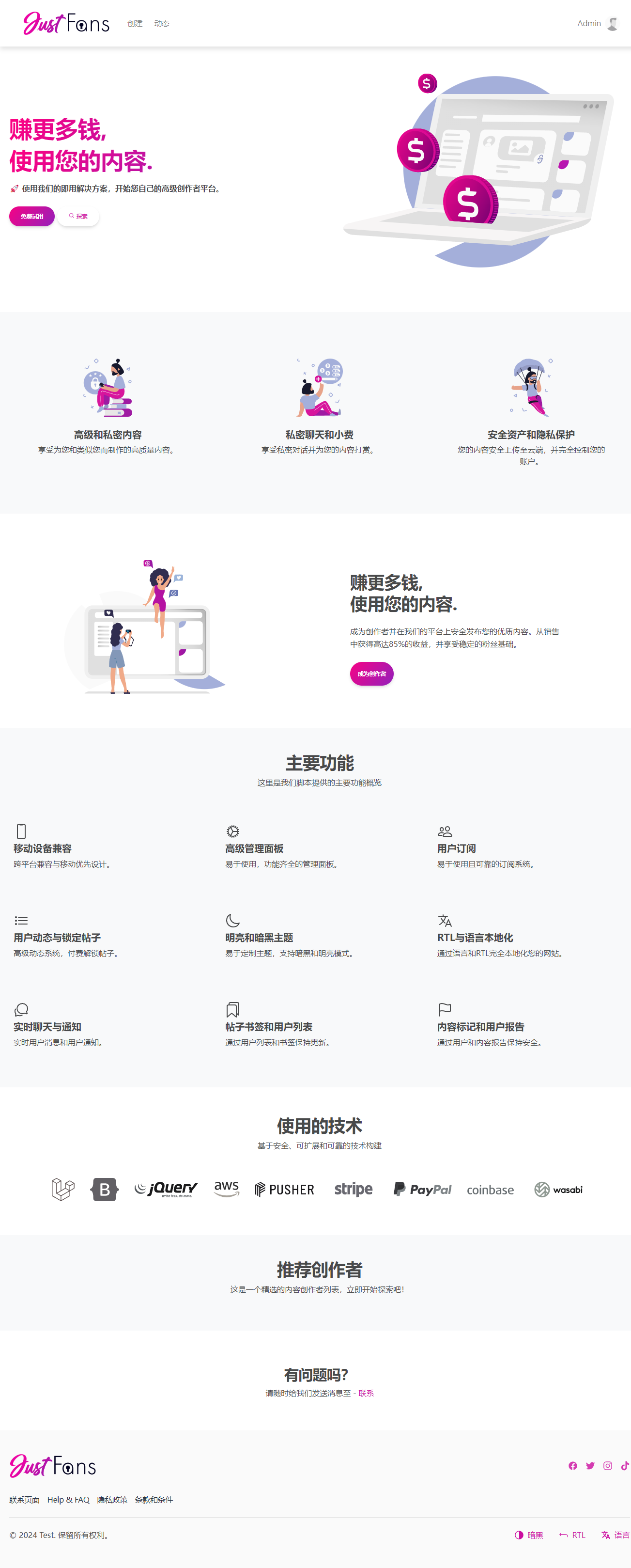 自适应多语言社交媒体平台网站源码/付费内容创作者平台源码