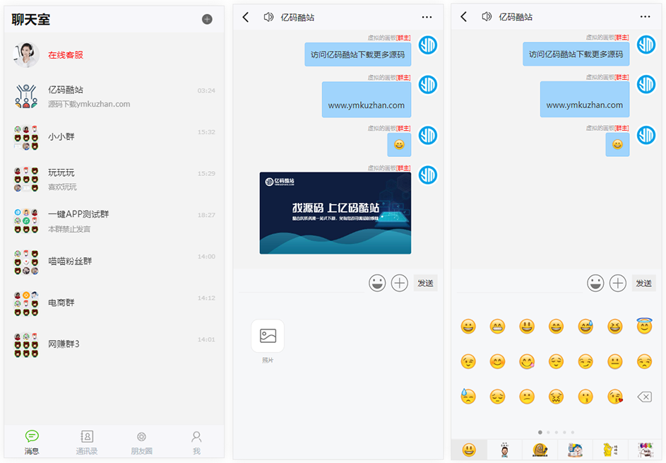 支持添加好友,建立群组,私聊,禁言功能、支持消息铃声提醒、发图、表情、群主踢人等一些基本功能