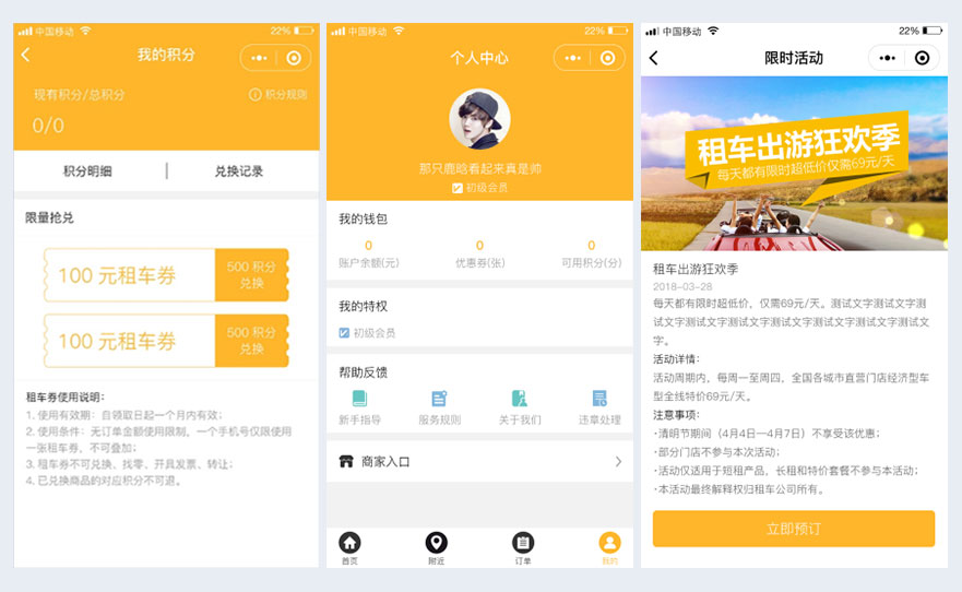 该租车小程序具有特价套餐、优惠券、签到积分、限时活动、会员等五大营销功能,所有页面支持自定义配色、自定义图标、内容、图片等。