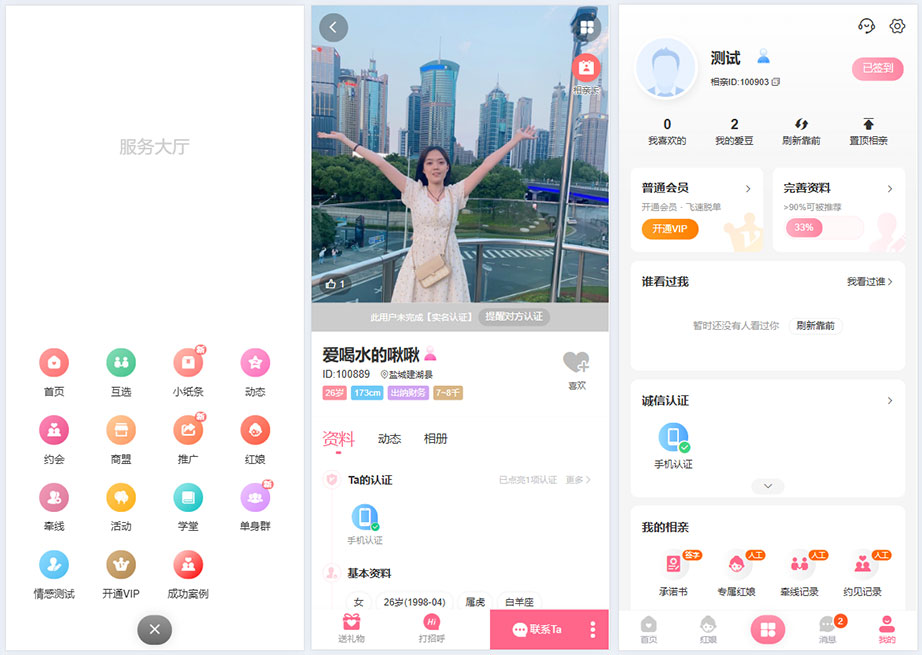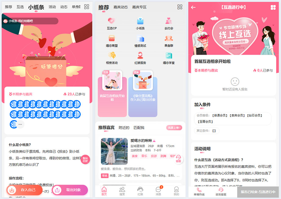 程序包含红娘服务、相亲活动、小纸条盲盒、交友匹配、付费交友、礼物系统等多个模块助力相亲交友成功