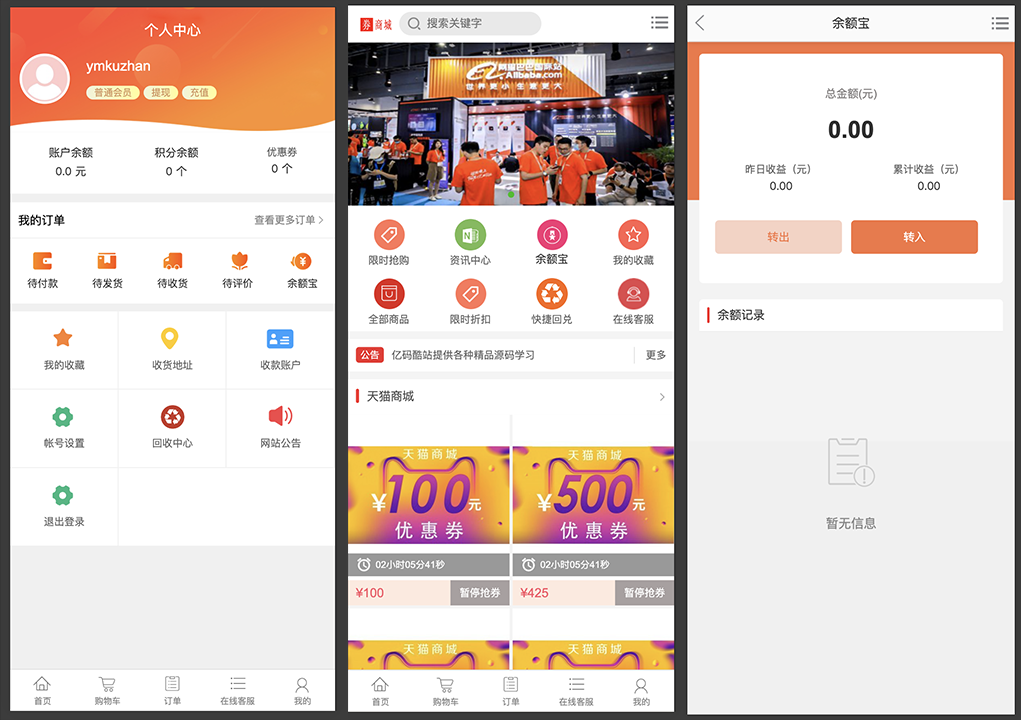 带搭建说明,点卡回收商城网站源码,带pc及h5页面、余额宝理财、回收、提现、充值、新订单语音消息提醒功能、在线客服、优惠券回收功能