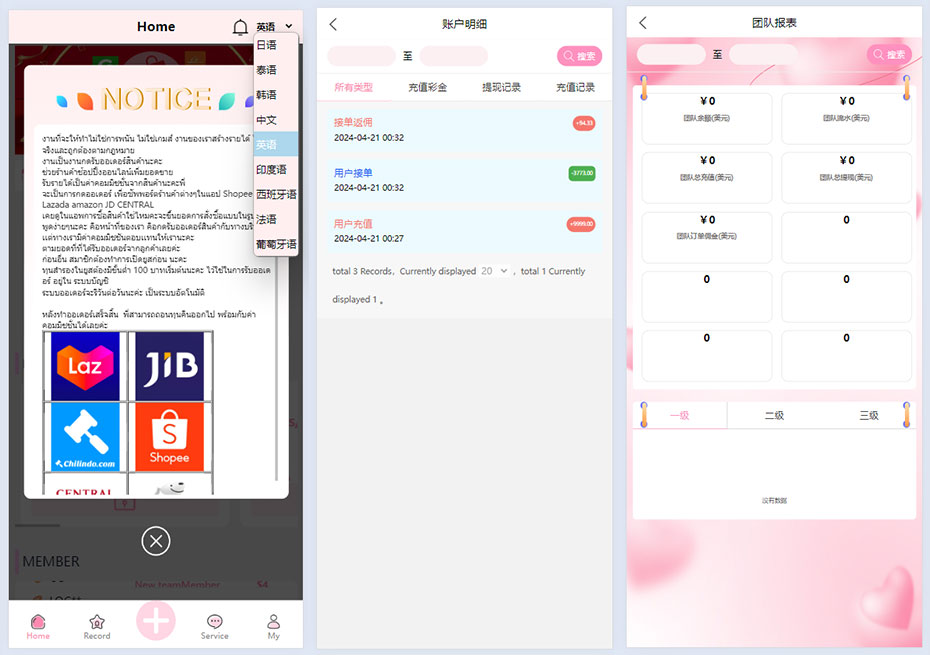 PHP多国语言海外商城自动抢单系统源码/返佣产品自动匹配订单/粉色UI出海商城拼单/抢单任务平台源码